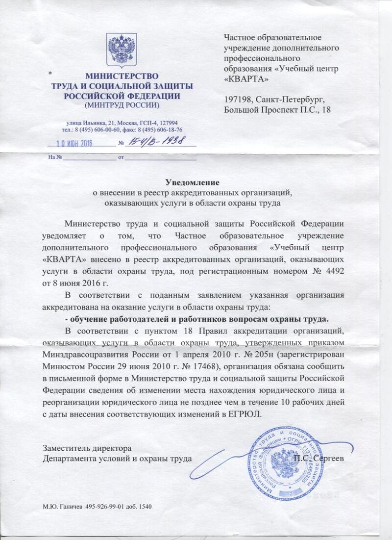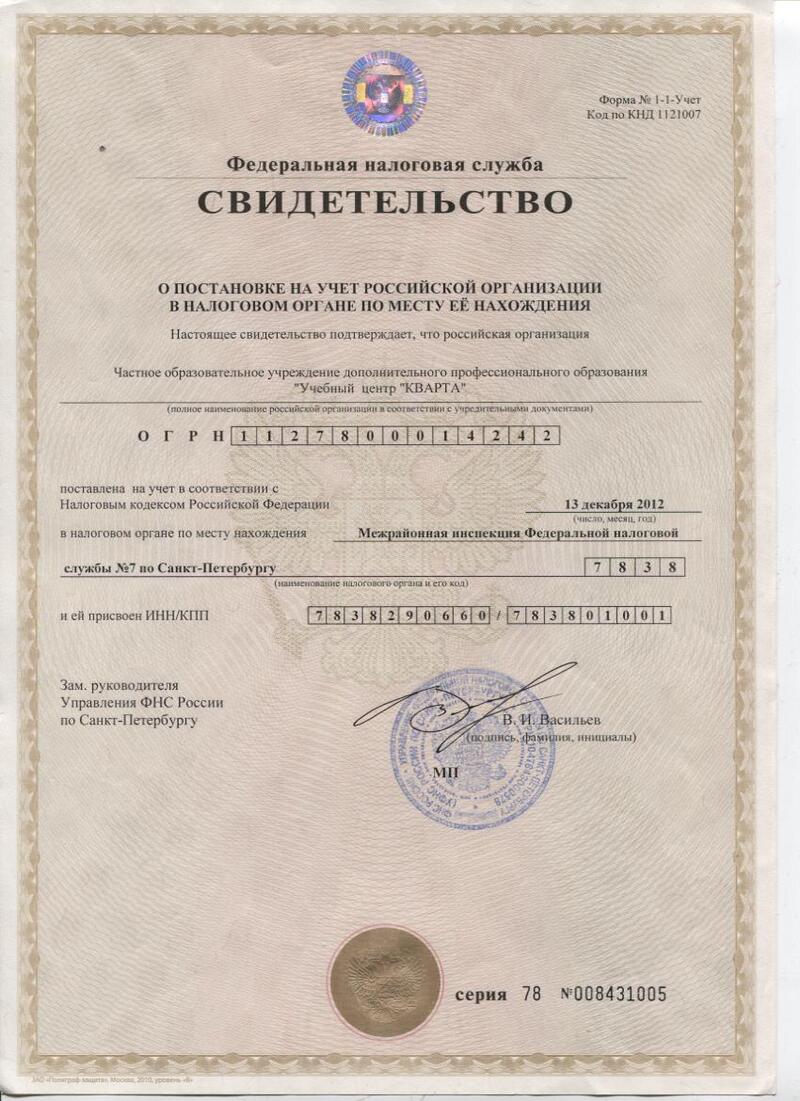 | Полное название организации | Частное образовательное учреждение дополнительного профессионального образования "Учебный центр "КВАРТА" |